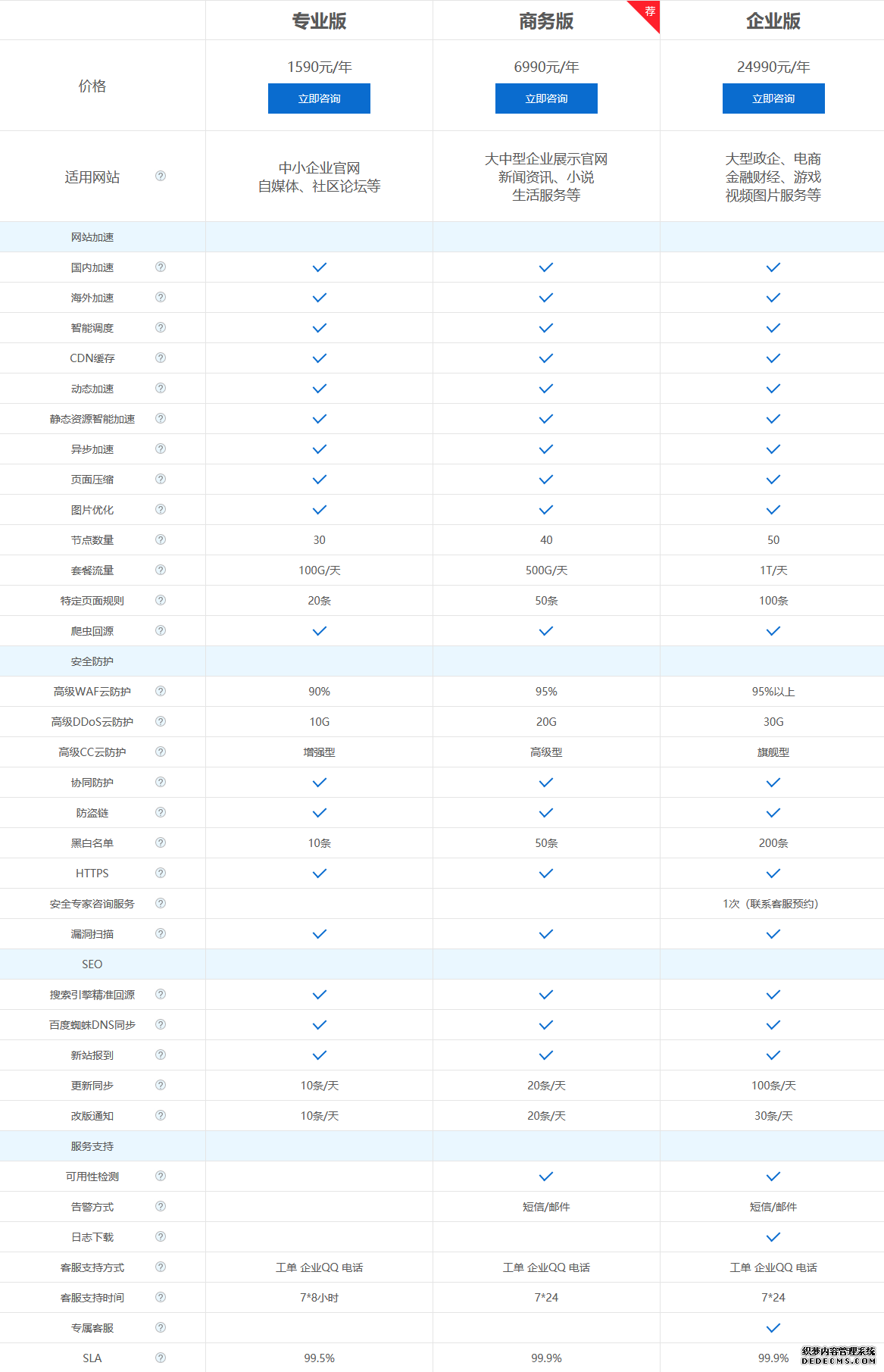 | 產(chǎn)品類型 | 適用網(wǎng)站 | CDN節(jié)點(diǎn) | 套餐流量 | CC防護(hù) | DDoS防護(hù) | SEO更新同步 | 客戶支持 | SLA可用性 | 價(jià)格 |