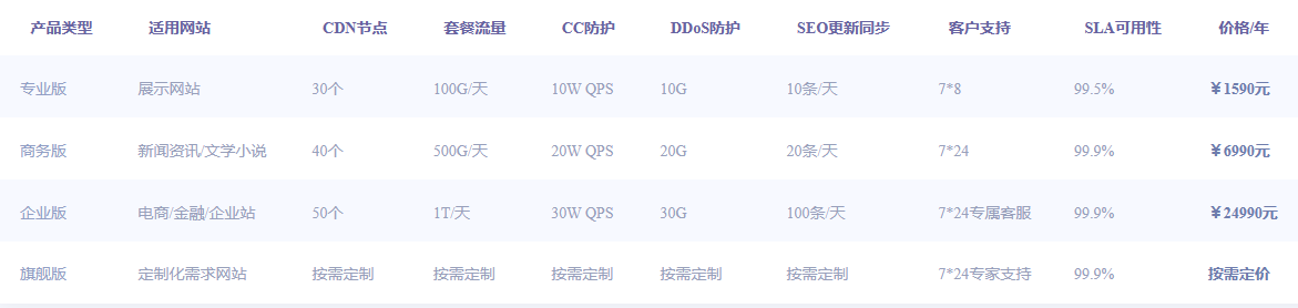 | 產品類型 | 適用網站 | CDN節點 | 套餐流量 | CC防護 | DDoS防護 | SEO更新同步 | 客戶支持 | SLA可用性 | 價格 |